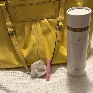 Elegant yellow tote with sleek leather finish. Features sturdy straps and roomy interior. Prizes inside perfume and love stone broken open by my grandson