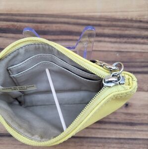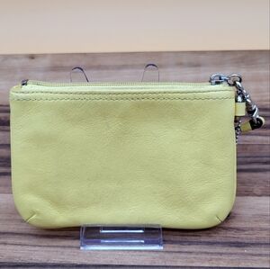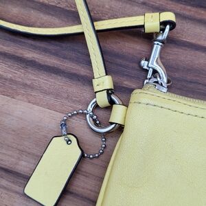 This Coach wristlet in yellow is perfect for adding a pop of color to your outfit. Crafted with quality materials, it offers both style and functionality. Ideal for carrying your essentials on the go.