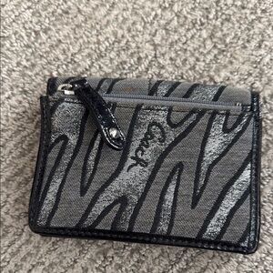 Stylish Coach wallet with zebra print. Features black and gray tones. Perfect for everyday use.