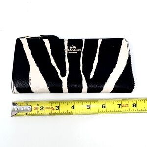 COACH zip-around long wallet. Features a black and white zebra pattern made of high-quality PVC leather and measures 4 inches in length and 8 inches in width. It comes with a back card pocket for easy access to your cards and other essentials.