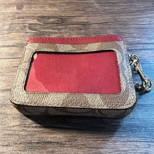 Signature coated canvas and smooth leather Two credit card slots ID window Open pockets Zip compartment Chain wrist strap with dogleash clip attached 3" (L) x 4 1/4" (H) x 3/4" (W)