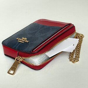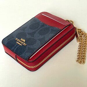 Coach Zip Card Case Wallet CW883 Blue Denim Red Canvas Chain Strap ID