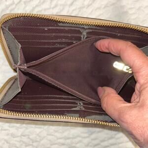 Coach Zippy Beige Patent Leather Wallet. Preloved. Outside great condition. Peeling inside but not sticky. See pictures for more details.