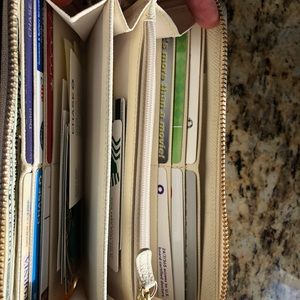 Beautiful Coach wallet in used condition. Has 12 card slots, 2 bill compartments, change area and several other areas for receipts, etc. outside also has a pouch in back. Several scratches and wear as reflected in price. Because of the leather on this wallet some areas of wear aren’t as noticeable.