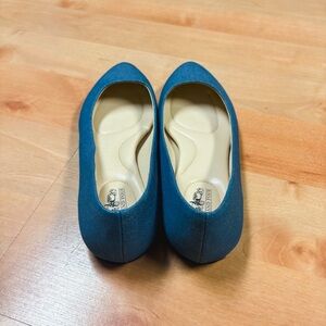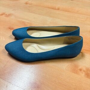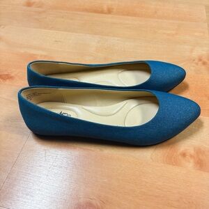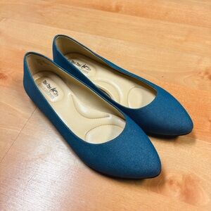 Womens beautiful glittery chambray denim blue slip on pointed toe flats from Coach and Four in style “Melitta” in a beautiful Chambray Glitter Denim Blue color - excellent used condition