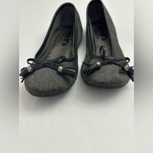 Coach and Four, Womens Shoes, gray and black, ballet flats,slip on, bow with tassels, Size: 7 Fabric upper. Minimal pilling in the insole as shown in the photos. Preowned in very good condition