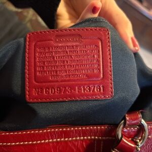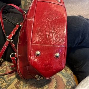 Vintage bag made from luxurious patent leather in a classic cherry red color. Features a pleated design, silver hardware accents, embossed coach on front. Fabric interior, two exterior side pockets, adjustable shoulder straps. Good used condition with a stain on bottom as shown in pictures.