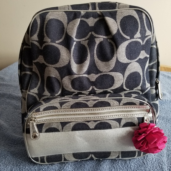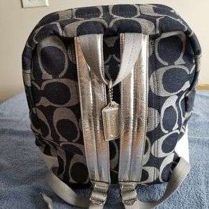 Like new Denim style with silver trim coach backpack, no wear on straps, no stains, clean and smoke free. Measure 14 tall 13 wide and 5 deep. Only used a few times because my laptop wouldn't fit. Can provide any additional pictures