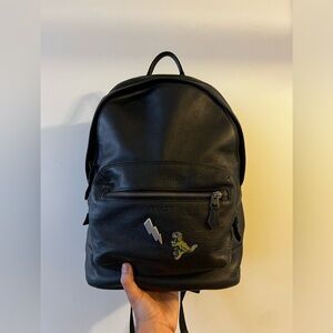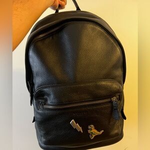 Coach black pebbled leather backpack with custom emblements as pictured. Worn a couple times almost brand new bag has laptop pocket inside with two compartments along with zippered pockets. Authentic and rly unique bag
