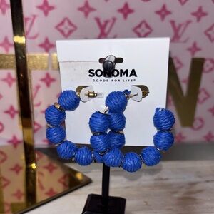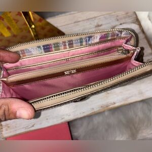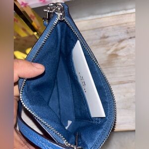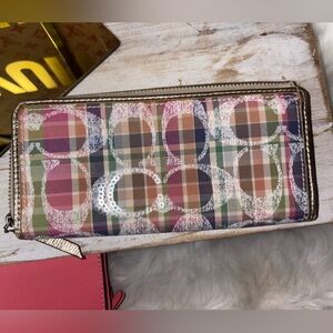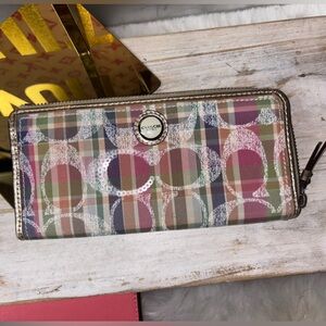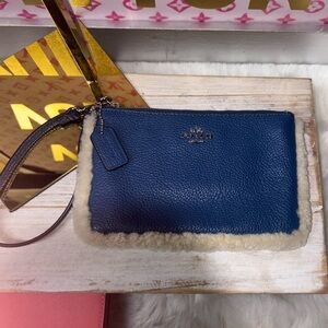 Coach tartan plaid backpack in good condition she has peeling on her trim which can be fully removed and repainted which I was gonna do but no time! You will get the cute blue leather fur trim Coach wristlet and the matching wallet which is in great condition and lastly you will get the New Sonoma blue hoop earrings.