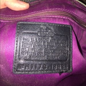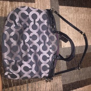 Black and grey original coach bag. Medium to large size. Purple interior. Has two pockets inside as well as a pocket with a zipper. Able to carry lots of things. Wonderful bag