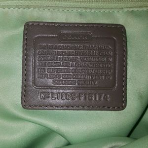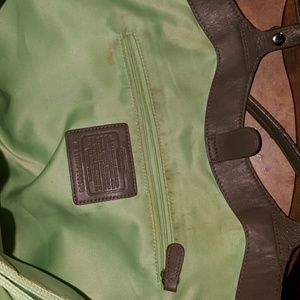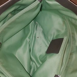White pebbled leather with grey leather handle. The outside looks really good. Only one small dot and a little abrasion down at the bottom. Inside is pretty clean. It has one dot and then a little discoloration on and in the side pocket inside. The zipper works . Beautiful accent color inside.