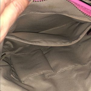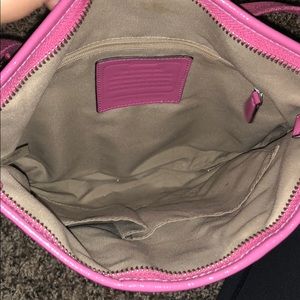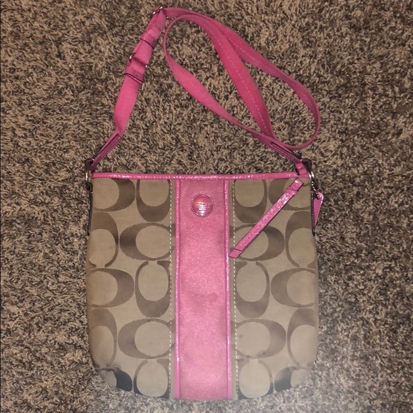 Pink and tan coach side satchel, has a couple spots on the front but could easily be dry cleaned!