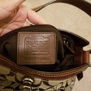 This one I purchased from the Coach website. Its unique closure is something I always loved about it. It's more of a medium size handbag with brown leather trim. Comes from a smoke-free home.