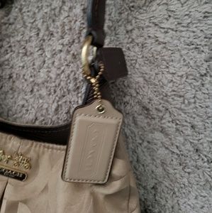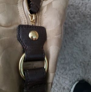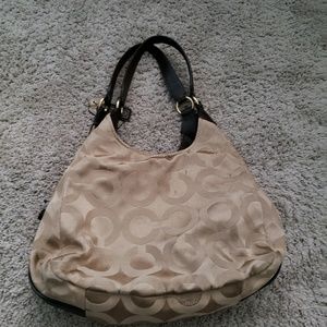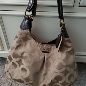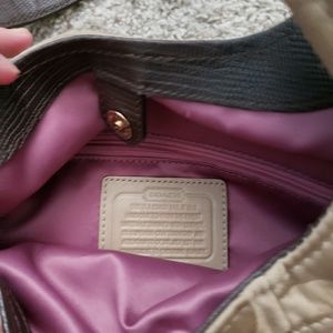 Classy brown fabric coach bag. Preowned in good condition with some signs of wear on the outside. Interior is in excellent condition with no stains or tears.