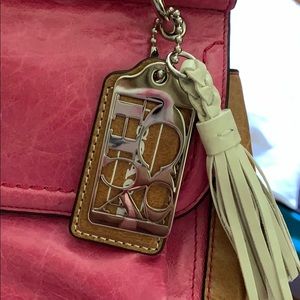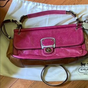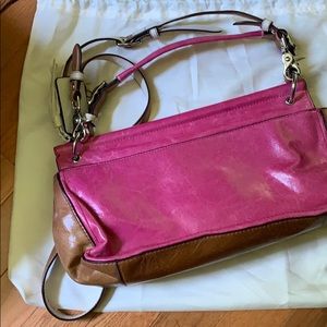 Multi color hot pink, tan, and cream color. Detachable strap.
