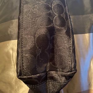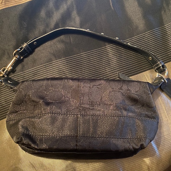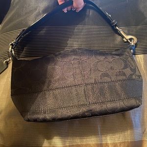 Small coach bag. Perfect fit all of your essentials. Clean exterior black and shimmery C,s. Teal blue interior with marks inside please see all photos.