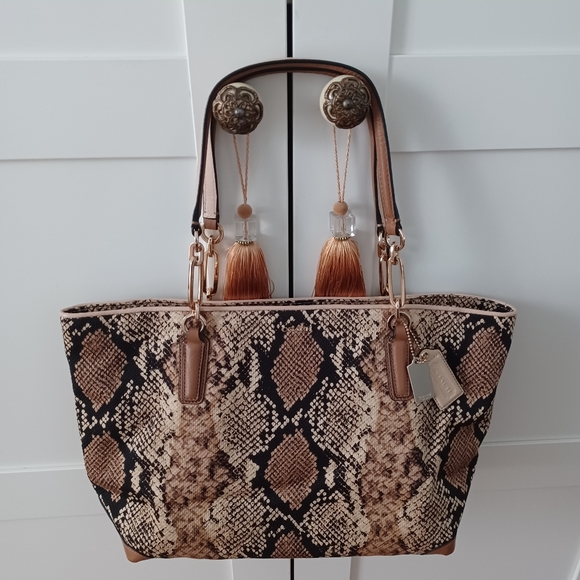 Coach bag, half gold link handles,,great condition, it has very little pen scratch inside of fabric, as you can see in the pictures, otherwise in great condition. The colors are brown, cream, black.