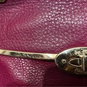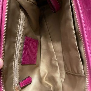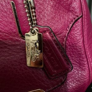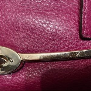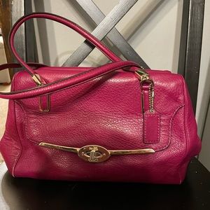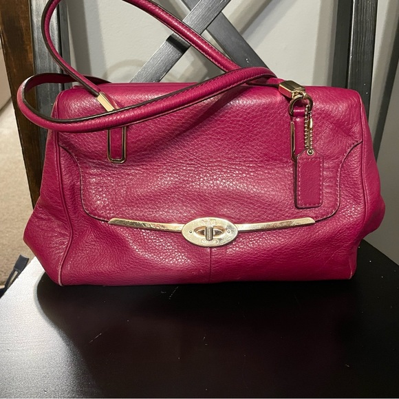 Raspberry Coach bag. Outside pocket with turn lock. Small scratches on gold (see photo). Inside pocket and zipper pocket.