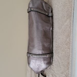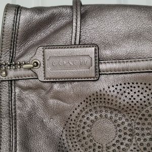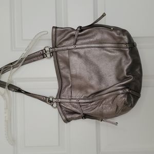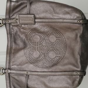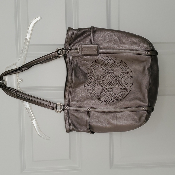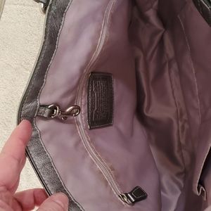 pewter colored, Large Coach purse , leather, 1 slit pocket across back side of purse, 2 open pockets inside,1 larger zip pocket inside, minor wear on this pre loved purse, approx 11"tall, 14" across, 4"wide at bottom, 9"handle drop, this is a very cute bag with soft leather in really good condition.