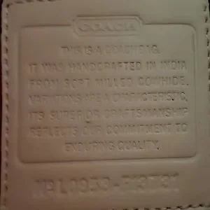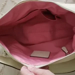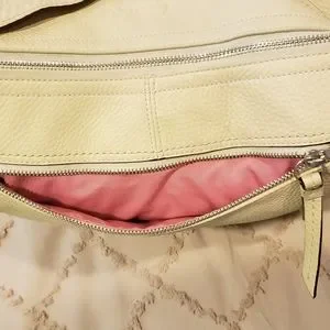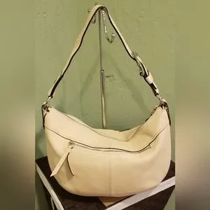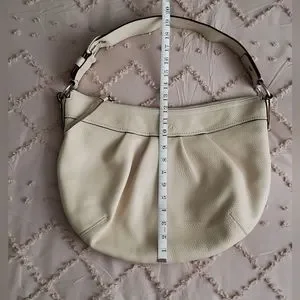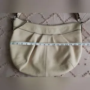 Cream colored coach bag. Buckled strap is approximately 20 inches in length. Width and height are measured and pictured. Bag has large opening with zippered interior pocket and 2 opened pockets. The bag also has a deep zippered pocket on the outside. This bag is in great condition!