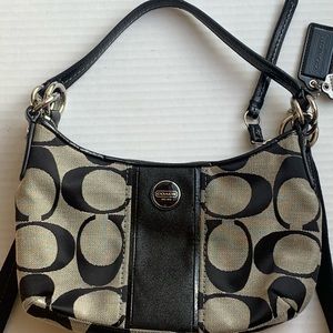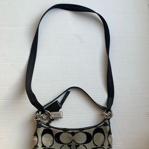 Black and grey coach monogram bag. Super cute. Can be worn as a shoulder bag or crossbody. Inside is clean. In great condition. 100% Authentic