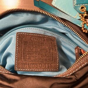 Coach handbag circa 2005. Black nylon material with aqua marine color on the inside. Very good shape. Will ship in duster bag. Gold hardware and leather trim.