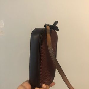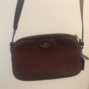Purple/red color, knit look with leather lining and strap. 2 zipper pockets, fits phone/keys/money/cards/small makeup. Adjustable strap