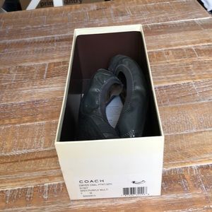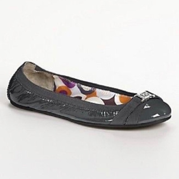 Grey patent leather Coach ballet flats in original box. Silver logo buckle on toe. Outside of shoes in perfect condition with minimal signs of wear on sole. Only worn a few times. Gold on insole of shoes is worn off, but there is no damage to leather.