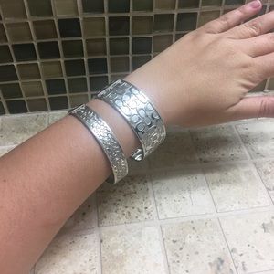 Two beautiful silver plated COACH bangles • 1/2" and 1" • wear them both or one at a time • great edition to any arm party 🎉