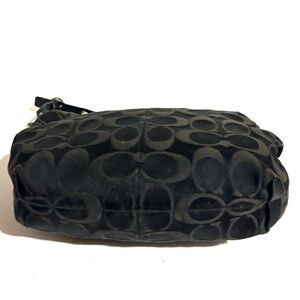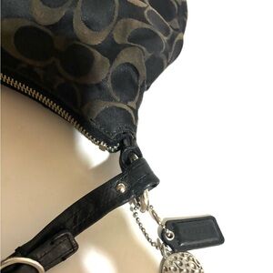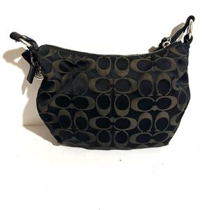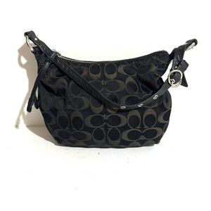 This Coach shoulder bag in black is crafted from the brand's signature canvas, featuring a stylish hobo design with leather trim accents. The adjustable leather strap and slouchy silhouette make it a practical choice for everyday use. Its medium size and silver-toned hardware add a touch of elegance to this versatile accessory. Main compartment 1 open pocket at interior wall lining have stains leather trim hangtag at side strap have minor distressed hight 7.5” wide 10.5” depth 1.5” strap drop 8” The dimensions are based on approximately measurements before placing an order please check take a moment to view all photos using feature for a closer look