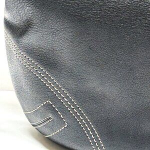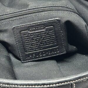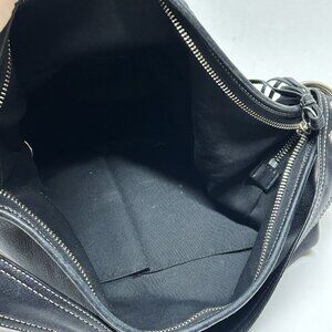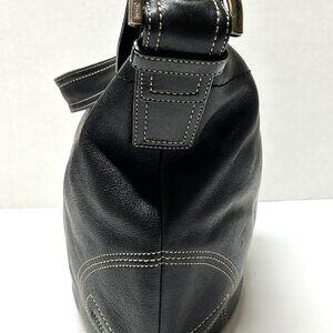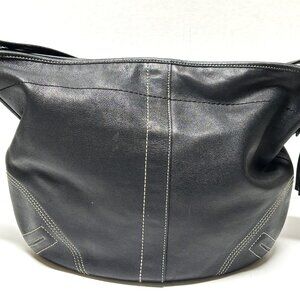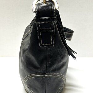 This listing is for a black leather shoulder bag by COACH with gorgeous exposed contrast stitching. Zipper enclosure and zipper pull has black fringe leather tassel intact. Interior is a black linen lining with two open slip pockets and one zipper pocket with the Coach leather label. Approximate size is 3.5 inches deep, 12 inches wide and 9 inches tall.