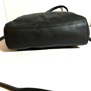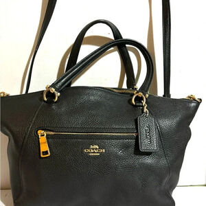 Coach black leather satchel handbag with gold tone hardware main compartment 1 zip pocket closure at interior wall fabric lining zip pocket closure at front hangtag at side exterior have some dent stains lining minor stains hight 8” wide 14” depth 2.5” strap drop 6” shoulder strap 22”The dimensions are based on approximately measurements before placing an order please check take a moment to view all photos using feature for a closer look