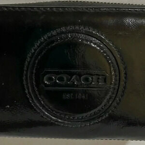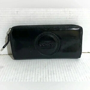 Coach black patent leather wallet with silver tone hardware main compartment fabric lining plenty of space logo at front open pocket at back lining have some stains exterior have minor marks scratches hight 4” width 8”The dimensions are based on approximately measurements before placing an order please check take a moment to view all photos using feature for a closer look