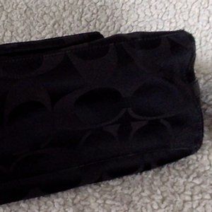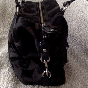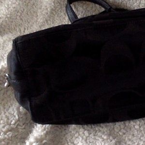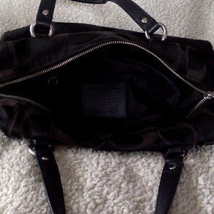 Classic and simple signature C's handbag that features the elegant satin feel and sheen with leather trim and silver hardware. Front pocket has the magnetic closure. Main compartment is zippered. Inside has zippered pocket and 2 slip pockets. Condition is very good with some wear on the corners and a small snag on the bottom, please zoom in pictures. measurements are 13 inches by 4.5 inches by 8.5 inches, approximately.