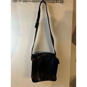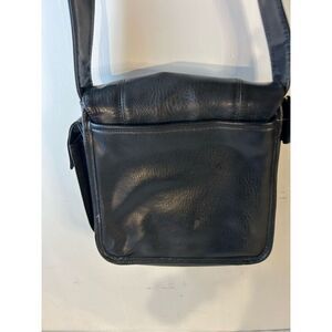 Coach black leather flat saddlebag style buckle vintage scuffs. measures 12"x10" with 19" strap.