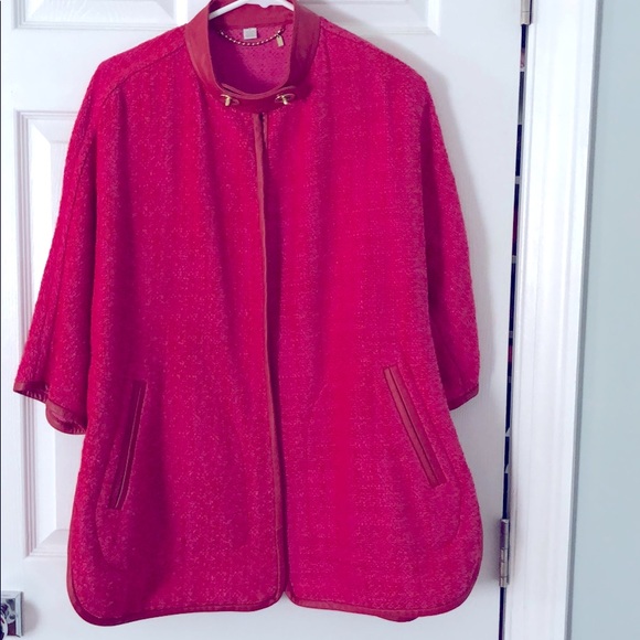 Beautiful fabric cranberry pink blazer with red leather trim and a gold toggle clasp. Slits on the side, half sleeve and so easy to wear with a variety of choices.