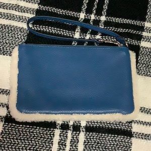 Coach brand blue leather wristlet wallet. Sherpa trimmed. Silver colored hardware & logo on one side. Inside has 2 slot pockets for cards. Excellent condition.