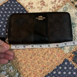 Coach brown and black wallet with gold Coach sign on the out side gold zipper only carried a couple of times so it’s in like new condition