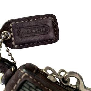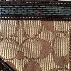 Coach brown signature fabric wristlet. Brown suede accents and beaded band detail. Silver hardware. Suede shows some imperfections and wear. See photos. Fabric and lining in good preowned condition