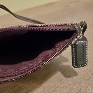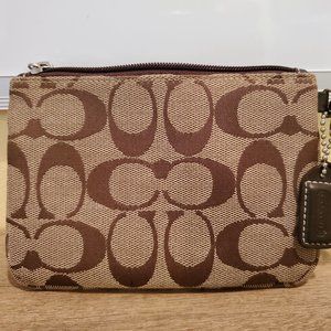 Small zippered clutch with dark brown leather trim and signature C canvas fabric. Brand new condition. Roughly 6" by 4". No interior pockets.