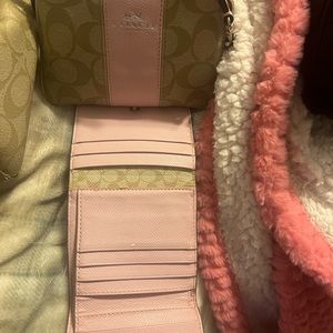 Previous loved bag. Tan and light pink. Handle is worn and inside needs cleaning. But I will be selling this as a bundle purse, small wallet and smaller wallet.