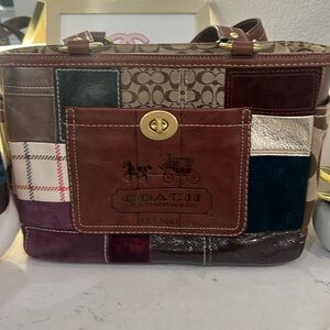 Coach bundle vintage limited edition holiday patchwork tote wristlet dustbag box. Napa leather, dusted suede, suede, signature jacquard, velvet, crinkle patent leather, metallic leather, zip closure fabric lining. Outside pocket, measurements: 12 1/2” L x 9” H x 4 1/2 W. Small scratch on the back of the back. Please see all pictures. Comes with a wristlet (same style) dust bag and a coach box and coach tissues . Beautiful vintage rare bundle.