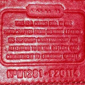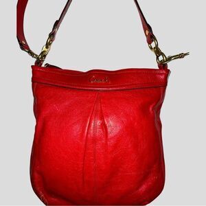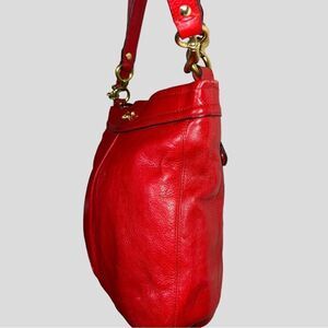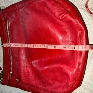 Super nice, hard to find this one. Candy apple red leather bag with gold logo on front. Hand strap 10” drop and detachable shoulder strap. 22” drop zip up slip in pocket on back. Zip up complete closure. Interior is roomy with 2 slip ins and on zip up pocket! Euc!!!