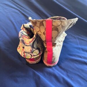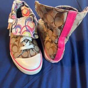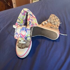 Coach canvas and leather high top ladies, Coach sneakers, tennis, athletic shoes, size 6.5. Normal wear, otherwise in good vintage condition. From a smoke free home.