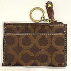 Coach cardholder with keychain. Used occasionally and has minor scratches on the keychain, no wear or tear on the pouch.