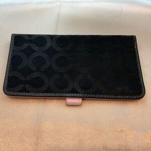 Newer “C” signature print check book holder, black on black leather, with pink leather inside. Has a pen holder.
