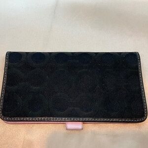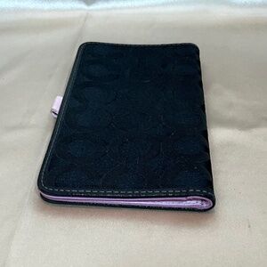 Coach checkbook holder, black signature print with pink leather interior. 8-H7B