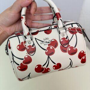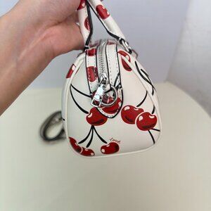 This is a COACH brand handbag with a white background and a vibrant red cherry print pattern, lively and playful. Equipped with a handle and detachable shoulder strap with the same printed pattern, the front of the bag features the classic logo of Coach, making it a distinctive style of the brand and suitable for daily use