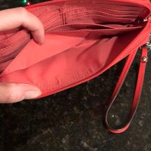 Leather coach clutch. Good condition, some signs of wear but pictures show. Small front zipper pocket second pocket and large main section for cards and money and phone.